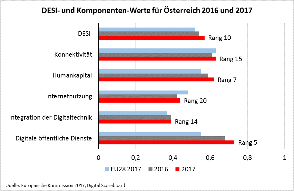 Zwar belegt Österreich im gewichteten Gesamtranking Platz 10, betrachtet man jedoch die fünf unterschiedlichen Komponenten des Index im Einzelnen, so zeigt sich ein etwas differenzierteres Bild. In Bezug auf die Komponente Konnektivität und damit die Internetanbindung über Breitband ist Österreich im Vergleich zum Vorjahr um einen Platz zurückgefallen und liegt EU-weit nur noch auf Platz 15. Zudem schneidet Österreich bei der Internetznutzung mit Platz 20 weiterhin schlecht ab. Gemessen wurde, welche Aktivitäten von VerbraucherInnen im Internet vorgenommen werden: Etwa der Online-Konsum von Nachrichten, Musik und Filmen, sozialen Netzwerken sowie Online-Banking und Shopping. Im Bereich Integration der Digitaltechnik durch Unternehmen rutscht Österreich um gleich vier Plätze zurück auf Platz 14. Positive Entwicklungen gibt es bei den Komponenten Humankapital und Digitale öffentliche Dienste. Mit Platz 7 bzw. 5 befindet sich Österreich über dem EU-Durchschnitt.