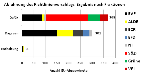 Die Allianz der Sozialisten & Demokraten (S&D), die Grünen und die Vereinigten Europäischen Linken (VEL) stimmten de facto geschlossen für die Ablehnung. Ihnen folgten mehr als ein Drittel der Europäischen Volkspartei (EVP), einige wenige Liberale (ALDE) und in etwa die Hälfte der fraktionslosen Abgeordneten (NI). Gegen eine Ablehnung sprachen sich vor allem die EVP, die ALDE, die Europäischen Konservativen (ECR), die Fraktion Europa der Freiheit und Demokratie (EFD), die Hälfte der Fraktionslosen und ein ungarischer S&D-Abgeordneter aus.