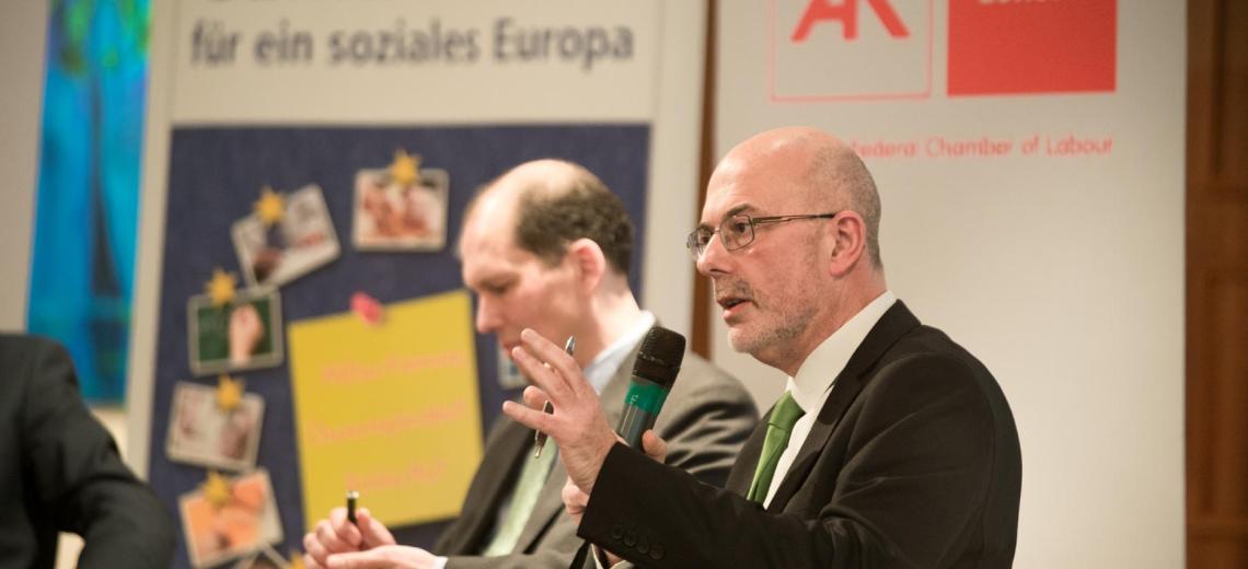 Oliver Röpke, Leiter des ÖGB-Europabüros, warnte in seiner Eröffnungsrede vor den Fliehkräften, die die aktuelle EU-Politik entfaltet. Mit einer Wirtschaftsdoktrin, die steigende Löhne als reines Wettbewerbshindernis sieht, hätte die Wirtschafts- und Währungsunion (WWU) keine Zukunft. Ronald Janssen teilte die Bedenken: In der Krise ist die Balance zwischen einer Wirtschafts- und Sozialunion im Sinne Jacques Delors völlig gekippt. Die Löhne sind EU-weit am Tiefpunkt angelangt.