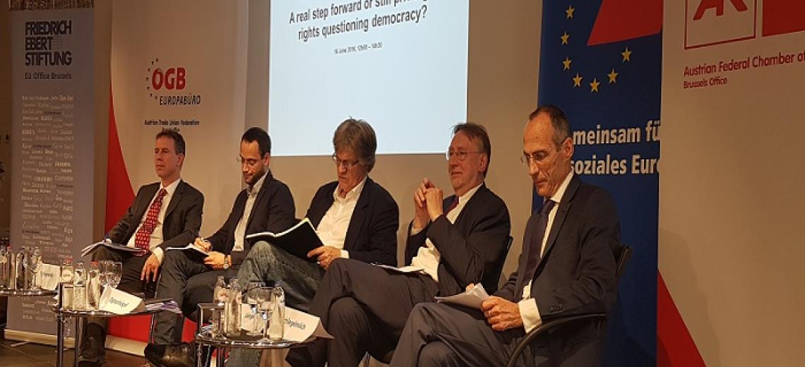 ZurückIm Rahmen einer gemeinsamen Veranstaltung der Friedrich-Ebert-Stiftung sowie den Brüsseler Büros von AK, ÖGB und DGB wurde die von der Friedrich-Ebert-Stiftung in Auftrag gegebenen Studie von Markus Krajewski und Rhea Tamara Hoffmann “The European Commission's Proposal for Investment Protection in TTIP” intensiv diskutiert.