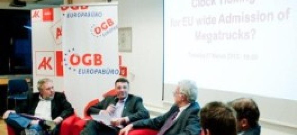BackPrompted by the newly reignited discussion about the cross-border admission of so-called mega trucks, HGVs with a weight of up to 60 tonnes and a length of up to 25.25 metres, the Brussels Office of the Austrian Federal Chamber of Labour and the European Office of the Austrian Trade Union Federation organised a short-term discussion event. MEP Jörg Leichtfried, Kristian Hedberg of the European Commission, William Todts of Transport & Environment, Joost van Doesburg of the European Shippers Council and Heinz Högelsberger of the Austrian Trade Union for Transport, Commerce and Service Workers vida were invited to the discussion as speakers.